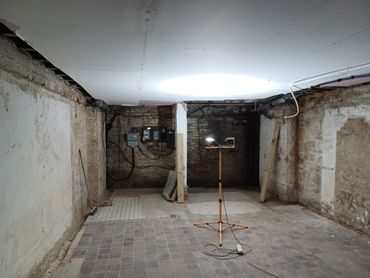 Having formed a dry box within the basement, the main contractor was then free to complete the dry-lining and lay the t & g flooring. Creating a large usable and clean space for an office, dry storage room and kitchen.