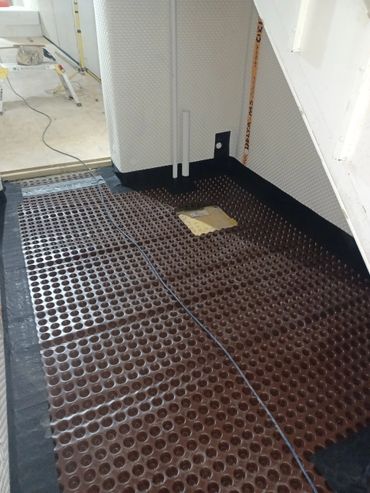 To complete the system a 20mm floor membrane was laid, then sealed to walls and service entry points.